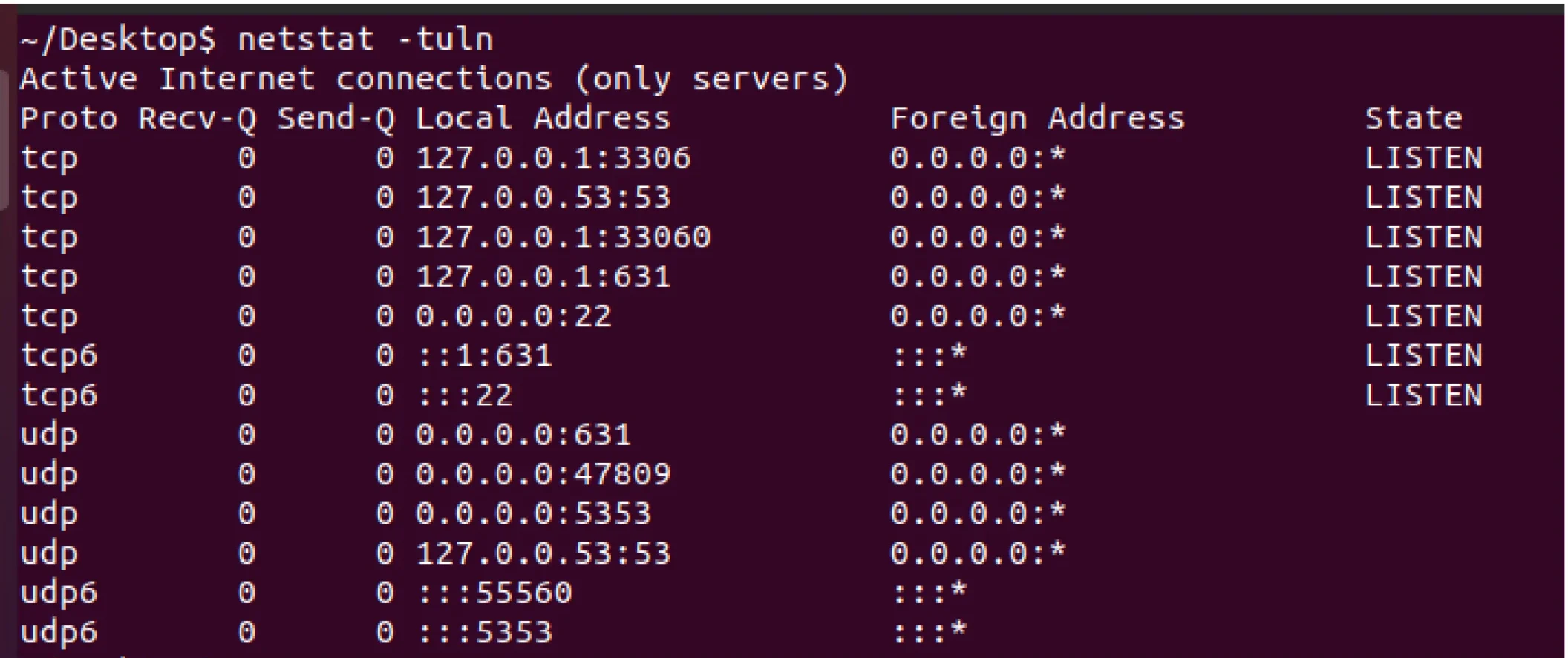 قبل از اینکه بتوانیم پورتها را ایمن کنیم، باید بدانیم کدام پورتها باز هستند و چه سرویسهایی پشت آنها در حال اجراست. این مرحله مثل بررسی درهای یک ساختمان قبل از نصب قفل و سیستم امنیتی است. برای این کار میتوانیم از ابزار netstat استفاده کنیم: