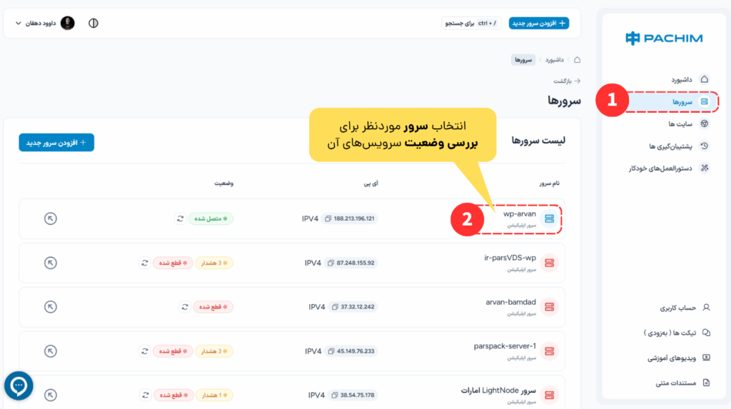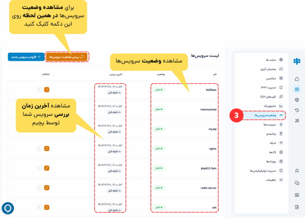 هر سرور برای اجرا، دارای سرویس‌های مختلفی است که با فعال بودن هر کدام سرور شما می‌تواند کار خود را به درستی انجام دهید، شما در پچیم می‌توانید خیلی ساده لیست سرویس‌های مهم خود را در بخش وضعیت سرویس‌ها مشاهده و مدیریت کنید.
