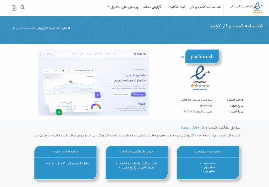 پچیم دارای نماد اعتماد الکترونیکی از مرکز توسعه تجارت الکترونیکی است. این نماد تأیید میکند که هویت کسبوکار، مالکیت دامنه، پشتیبانی و فرآیندهای مالی ما بررسی و ثبت شدهاند و کاربران میتوانند با اطمینان کامل از خدمات استفاده کنند.
